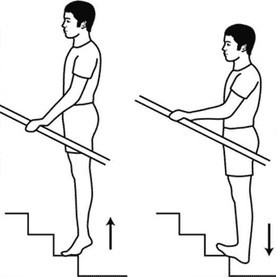 - Встаньте на ступеньку или книгу, чтоб пятка не упиралась в пол, и поднимайтесь на носки. Для эффективности возьмите в руки любую тяжесть.